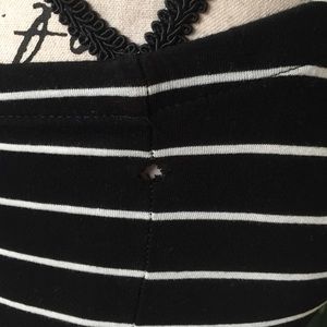 Strapless, black/white striped dress. Form-fitting with stretch. Size small. Very small hole near right underarm as pictured, otherwise in wonderful condition. Worn 3-4 times!