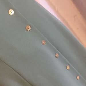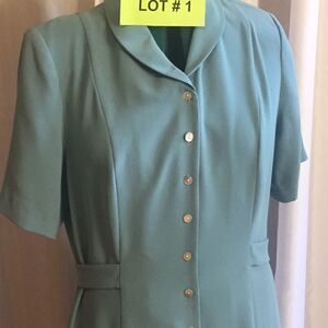 Color is turquoise, full button front, material is an easy care polyester, slightly padded shoulders