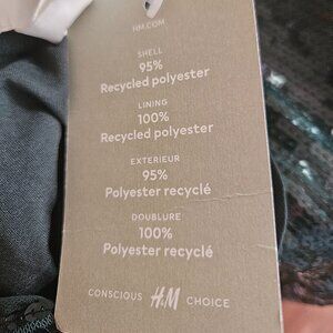 The hunter green sequined skirt is new with tags. The skirt has a back zipper with a button closure. It has a 18" side slit. It is a size 6. Made by H & M. The skirt is fully lined with 100% polyester in black. The shirt is 95% polyester and 5% rayon. Measurments: length is 33"s, waist is 28"s, hips are 28"s.