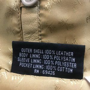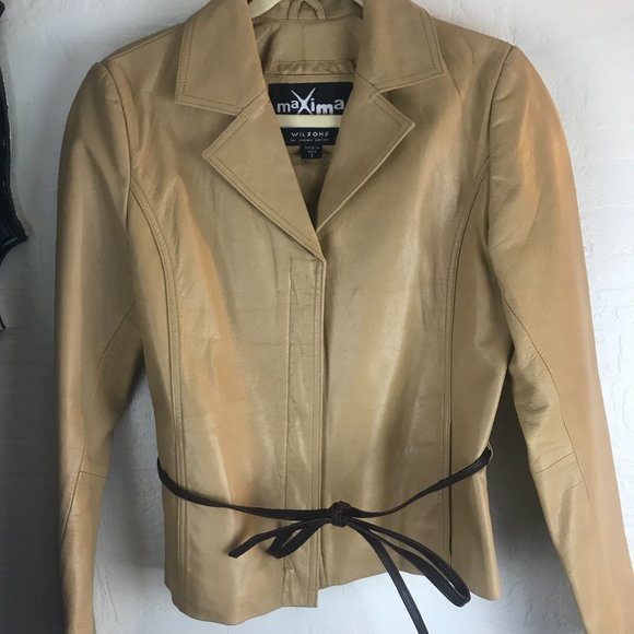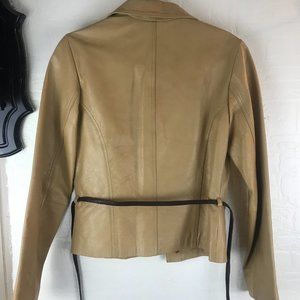 Womens Maxima Wilson Long sleeve Leat Jacket in a size S in a tan color with 2 pockets and fronts a belt in brown zipper front gently used.