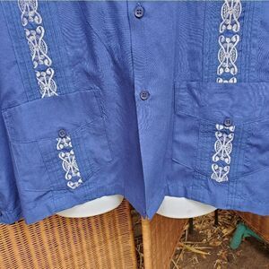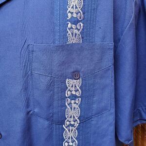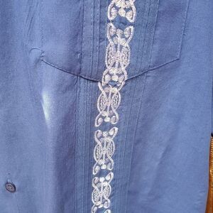 This is a Maximos USA Yucatan blue shirt. It buttons up the front, has 3 pockets on front, and beautiful lavendar panel stitching.