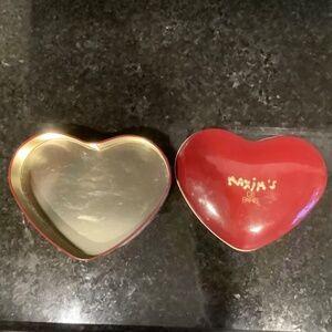Red heart tin was originally filled with candy and has a well fitted lid.