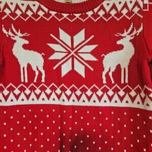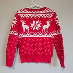 Cozy and festive boys’ pullover sweater by Maximus Rex in red and white Fair Isle pattern with reindeer and snowflake motifs. Size 6. Made from 100% cotton—soft and breathable for winter wear. Features a crew neckline, ribbed cuffs and hem, and classic holiday style. Perfect for Christmas parties, photos, and winter fun. Excellent pre-owned condition with no flaws noted.