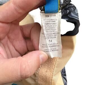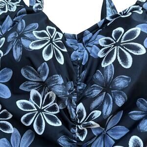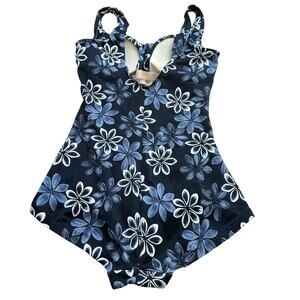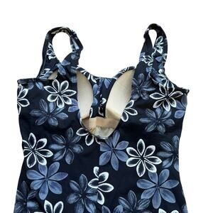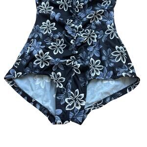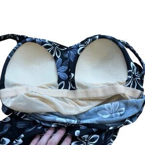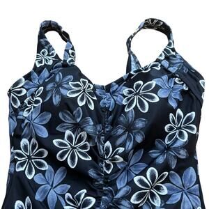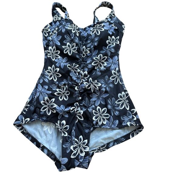 This size 14 one piece swimsuit by Maxine is black with white and grey Hawaiian flowers all over. The top is a v neck with built in padding (non removable). It features cinching all the way down the front for flattering tummy control. The back has a scoop back with a full coverage bottom.
