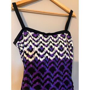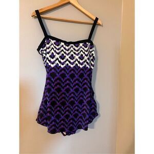 Maxine Of Hollywood 18 Ikat Print One Piece Swimsuit Blue Purple Flutter Bottom