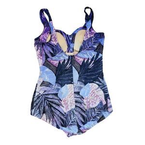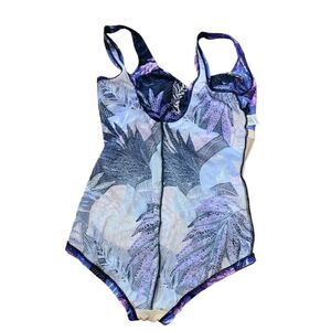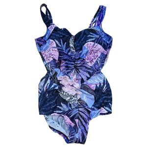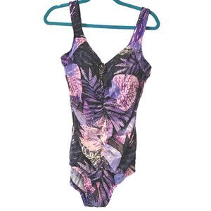 Maxine of Hollywood AZUL Womens PURPLE Tropical PRINT with light silver metallic detail | Ruched accent down the center of the One-Piece Swimsuit | Women's size 16 | Excellent Used Vintage Condition | Built-in Bra | Hand wash only | Nylon Elastane and Polyester materials | Please refer to the photos for the condition | 8 oz. | Measurements Laying Flat and UNSTRETCHED: Pit to pit 16.5" | Length 30" | Waist 14"