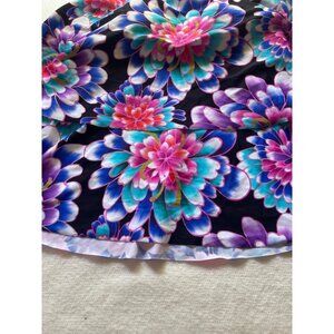 Vibrant floral swim top by Maxine of Hollywood. Features bold blue and pink flowers on a black background. Perfect for a stylish beach day.