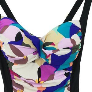 Design: Retro style skirted one piece swimsuit with slimming ruching at the sides and twisted front detail.