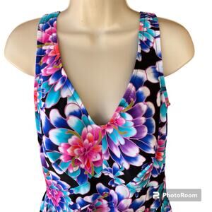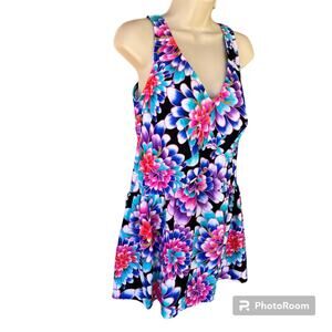 Maxine of Hollywood ladies one piece swimsuit dress with attached skirt for extra coverage. Bright floral tropical print in pinks, purples and blues on a black background, lightly built in, padded bra and lined tummy area. Small stitch defect at right side waist seam (pic). Women's size 16. Like new condition. 82% nylon, 18% lycra