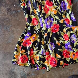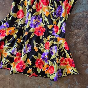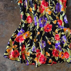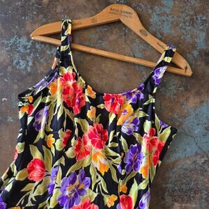 Vintage Maxine of Hollywood floral swim dress, size 18. Gently preowned, no noted flaws. Bright flower print on black background. Soft built in bra cups and slimming panels. It measures about 20" across the chest and about 29" from strap to saddle.