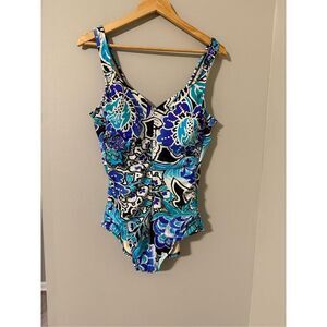 Maxine Of Hollywood 18 One Piece Swimsuit Blue Abstract Floral Slimming Ruched