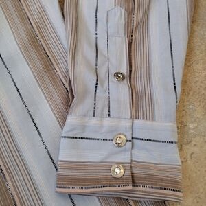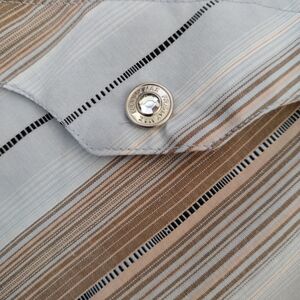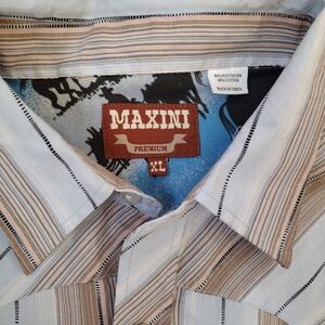 Maxini Premium Western Long Sleeve Brown Diamond Pearl Snap Shirt is a men's button-up shirt made of a polyester-cotton blend fabric. It features a spread collar, long sleeves, and button accents. The shirt has a striped pattern with a vintage western character and diamond pearl snap closure. It has pockets and is machine washable. The shirt is available in XL size and is suitable for casual and workwear occasions in summer, fall, and spring. The product is part of the Maxini product line and is made in China.