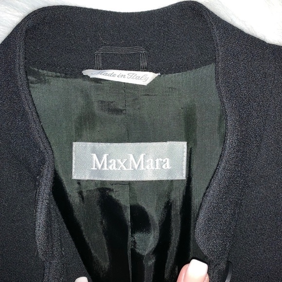 Beautiful MaxMara Jacket. Very classy. Has a mandarin collar and jetted pockets on front. Single button at end of each sleeve with split tail in back. 100% wool with 100% rayon internal lining.