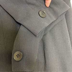 •Features: Black suit jacket blazer with textured detail. One button front closure. Lightly padded shoulders.