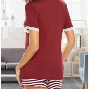 2 pc Sleepwear: V-neck short sleeves tee shirt top with striped pocket & Elastic waist striped short pants. Soft, lightweight, stretchy and comfortable