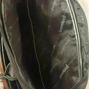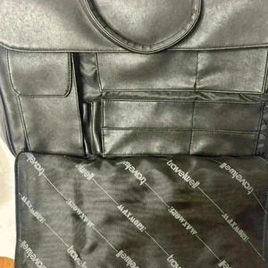 This Maxmore Travelwell bag is in excellent condition. No rips or tears or stains. Color Black. Made of synthetic leather and very durable. It has many pockets and compartments for your items. Capable of holding a 15 inch computer with plenty of space left for your files. Great for traveling whether by car or plane or train. The inside material is a nylon and is in perfect condition. If you have questions, please ask. Does not have a shoulder strap.