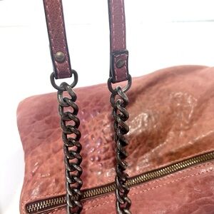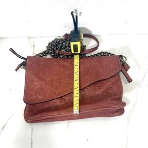 A distressed leather foldover crossbody bag with a chain strap. This style is versatile and can often be converted into a clutch by removing the strap.