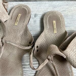 Suede flat thongs. Ankle wrap rivets. Back buckle. They fit true to size. Heel height: 1.5cm. Colour: sand. Upper: suede.