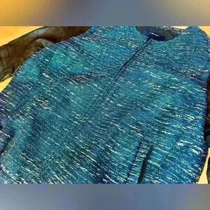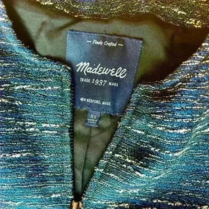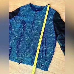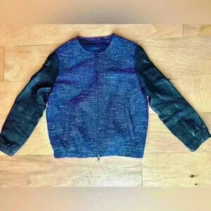 Good condition Madewell Leather Sleeve Moto Jacket. Body area is black & blue with shimmer. This fits like a true XS; please see measurements. Sleeves also have zipper detail. Front pockets. Retail $398.