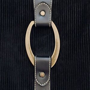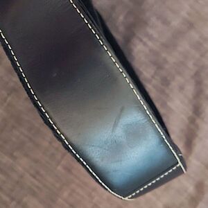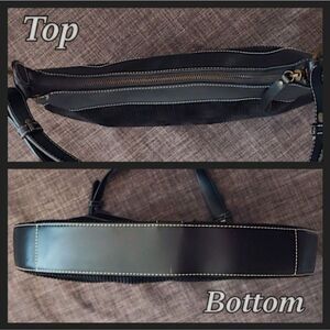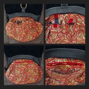 Black corduroy with metal bronze toned hardware and accents. Top full zipper closure. Slightly adjustable leather shoulder strap and trim. Colorful paisley sateen lining with four pouches / pockets and roomy main compartment.