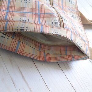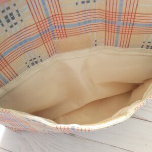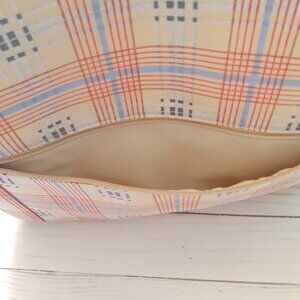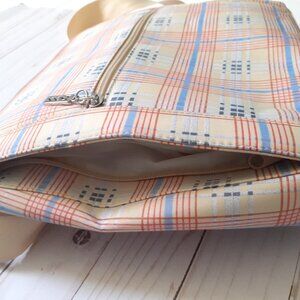 Very good pre-owned condition. Maxx New York Fabric Plaid Tablet Crossbody with Adjustable Strap. Base of bag is a cream/tan with a red and blue plaid. 100% polyester. Front of bag has a zip pocket, there are size zip pockets on each side of front, top has a zipper, and back has one open pocket that closes with a piece of hook and loop tape. Inside of bag has one zipper pocket. There is some discoloration on lining. Please see photos 12-14. There is also some very light discoloration at lower corner (photo 8) and on right side seam (photo 9). Bag does have light padding to help protect a tablet inside the main pocket. Bag has just been washed on gentle cycle in machine with Nellie's Laundry Soda.