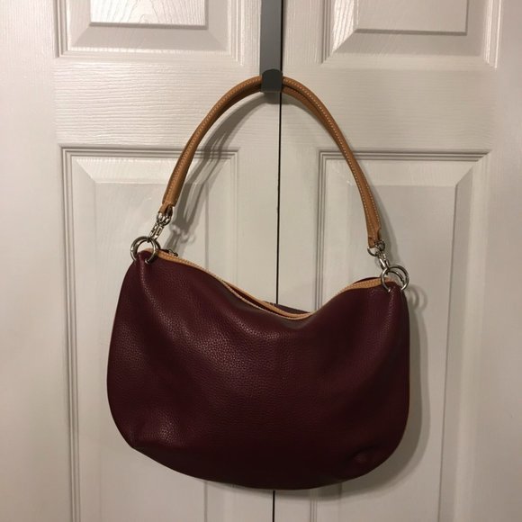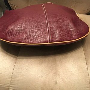 New, never used Maxx New York hobo shoulder bag, burgundy pebbled leather outside and beautiful brown/cream floral inside (no stains or tears). Beige/tan detachable leather straps in flawless condition, zip top closure with metal logo pull. 1 zipper pocket , 3 regular pockets, 2 pen holders and a key ring holder inside. One small factory flaw as seen in last photo ( piping didn't get sewed in) but not even noticeable. This is a great bag, just never used it so it needs a new home.