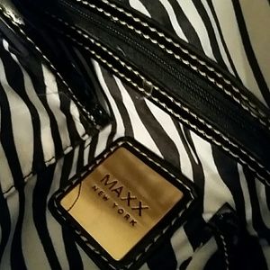 Score this Maxx New York Small Black Patent Bowling Bag w/ Gold Stitching. Bottom has 4 resting studs for support. Fully Lined Interior (zebra print). Zip top closure. Condition is Good & Clean