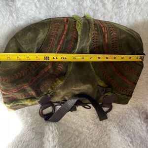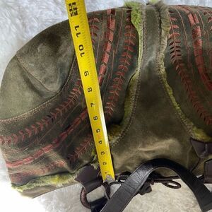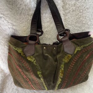 Maxx New York Hobo satchel leather suede olive green brown strap & embroidery, Rabbit fur accent snap top closure the spacious inside lining has a side zipper three side pockets pre owned in good used condition signs of wear on the shoulder straps no peeling see all pictures any questions please message.G5