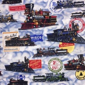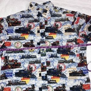 Vguc pfsf no stains tears or holes blue cloud background with trains, engines, locomotives, antiques, railway signs size medium no inside tag so check measurements