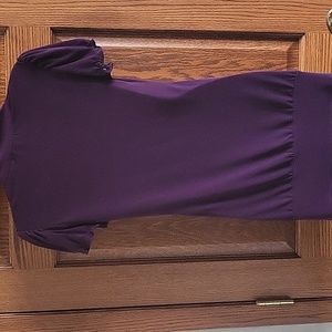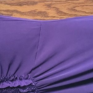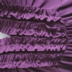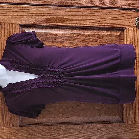 May BE top with ruffled detailed on front in raisin. This is a fun top with ruffles down the front and a deep v-neck line. Just accessorize and pull on your jeans or short to be ready to go anywhere.