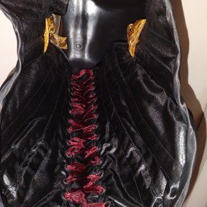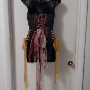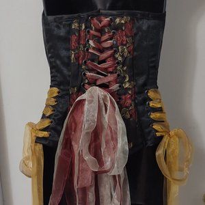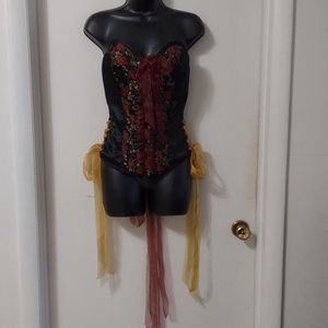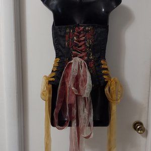 Over bust boned custom corset my friend asked me to sell. Made a good 15+ yrs ago by a PA renfaire corsetiere. She thinks it may have been May Faire Moon & it's hand-embroidered made of satin weave natural silk fiber. Hence why she paid so much for it. Her height is about 5' 5" and she was between a B and C cup when she wore this, size small.