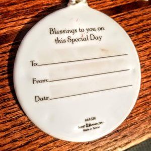 Purchased at a Christian book store. This would make a nice gift for a newborn baby or it can be used as a name tag on a wrapped gift package. See pictures above with sweet sentiment on front and To - From, and date on back. It is 3.5 inches round and has a white ribbon to either hang it or put on a package .It is well made with a shiny ceramic finish. Print is in gold. The sentiment reads as follows: