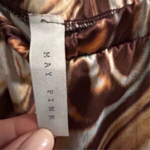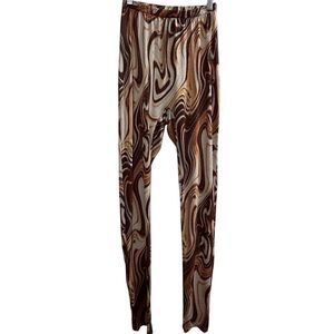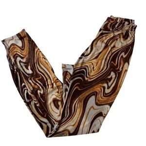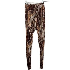 The May Pink leggings feature a multicolor swirl pattern and are designed for women. Made from elastic material, they offer a high rise with an elastic waistband for comfort. Suitable for casual occasions, these leggings have a 33" inseam and a 21" waist size, making them ideal for all seasons. They are machine washable for easy care. This pre-owned item is missing the size tag. Keywords: May Pink, multicolor leggings, women's leggings, marble theme, swirl pattern, high rise, elastic waistband, casual wear, machine washable, pre-owned.