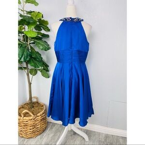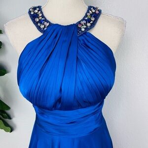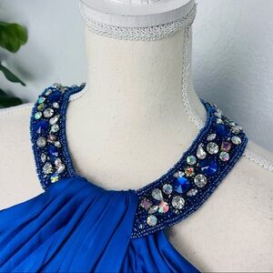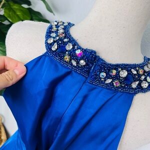 May Queen Couture Royal Blue Satin Flare Halter Top Embellished Sequins Dress