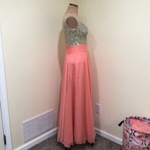 May Queen Prom Dress Size 2 Coral Pink Aurora Borealis Rhinestone Gown