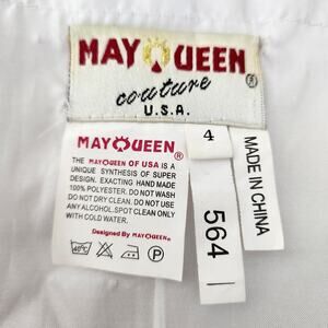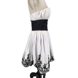This May Queen Couture strapless mini dress blends romantic charm with playful structure, featuring a white bodice and skirt accented by a black ruched waistband and a voluminous bubble hem. The black floral embroidery at the hem adds vintage-inspired detail, while the mini length and strapless neckline create a flattering, standout silhouette. A head-turning piece, perfect for garden parties, bridal showers, or elevated summer styling.