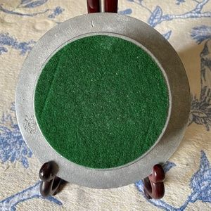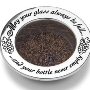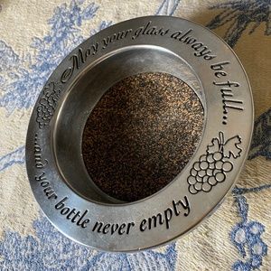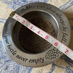 Wilton Armetale's "May your glass always be full...and your bottle never empty" wine bottle coaster in VGUC, "the perfect complement to any wine occasion". Decorative grape bunches on sides. Measurements, photos 4-5. RWP (Ralph P. Wilton) stamp, photo 3. All angles shown. A little dulling, but overall good shape! Last 2 photos from catalog.