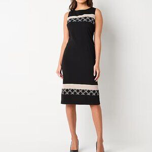 Includes a sleeveless shift-style knee-length dress with tweed-pattern detailing and a coordinating ¾-sleeve textured jacket for a polished, comfortable look.