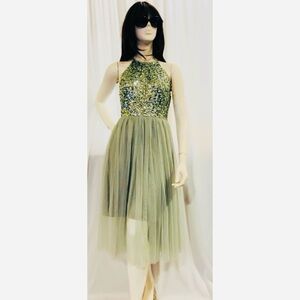 Green midi dress features a beautifully embellished sequin bodice that catches the light from every angle. The refined halter neckline frames the shoulders while the skirt flows into an A-line silhouette with a lined tulle. A back zip ensures a snug and secure fit. Excellent condition, size 4. You can be assured of quality. Purchase with confidence from a top-rated seller, offering same-day shipping! Shop my closet for more trendy and vintage items to complement your style.