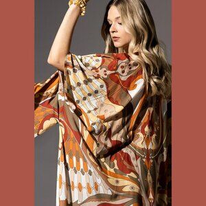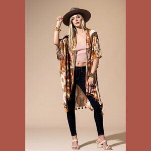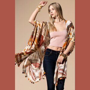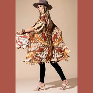 Get groovy with our Maya Elegance Kimono! This lightweight kimono features a playful marionette design and charming pom pom trims, perfect for channeling the spirit of the 70s. Made with 100% viscose, it's both stylish and comfortable. Embrace elegance and fun with this timeless piece, measuring approx. L 38" W 40".