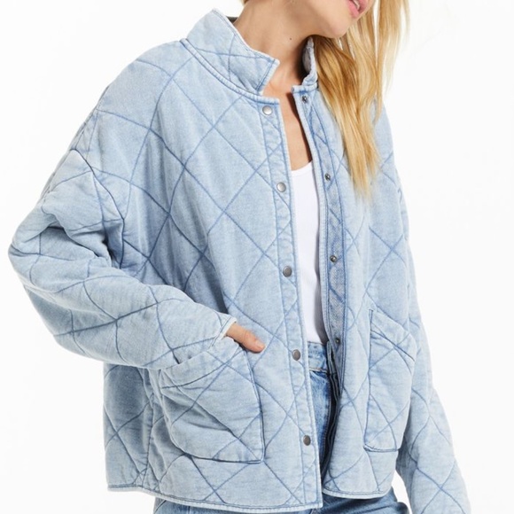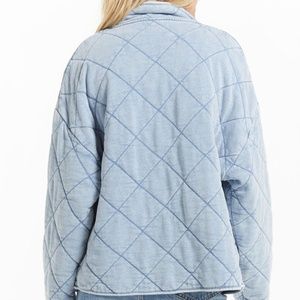 the well-known Maya Jacket is back, but this time in a knit denim French terry. This jacket is an absolute essential for the Fall Season. Details include a drop shoulder, stylish boxy fit. Patch pockets, snap-front closures, and quilted design throughout