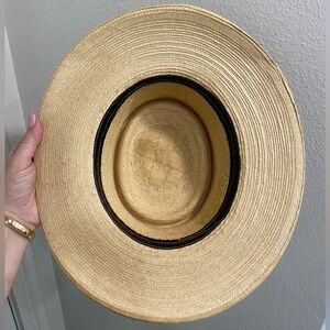 Elegant straw hat by Maya. Features a sleek black trim. Ideal for sunny outings. This hat is handcrafted from palm leaves, by the Maya – quiche Indians of Guatemala. It is a size 7 1/4 or hat size 58. It has a wire in the rim to keep it nice and straight. It is very sturdy and well-made. It is a very trendy boat hat style and would go great with any coastal chic outfit.