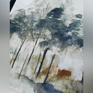 Maya Woods painting “Autumn Indigo” is a beautiful take on nature. With cool tones and abstract designs, this will look beautiful in any room of your home or office. This is not framed, it is a wrapped canvas print. Small flaw on the bottom, which is shown in photo, but great condition otherwise. Measurements shown in photos as well.