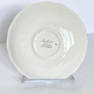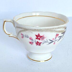 This Vintage Mayfair Delicate Pink Flower Footed Teacup and Saucer set is delicate English Bone China with an intricate gold trim.