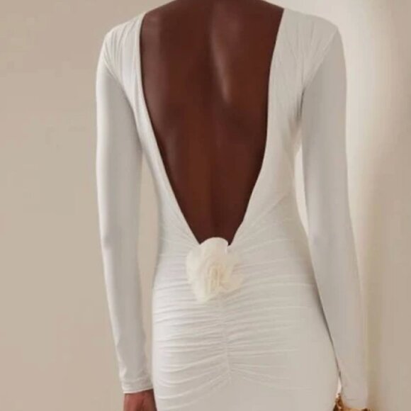 Maxi sheath dress with long sleeves. Deep slit back with ruched detail and a flower-shaped ruffle.