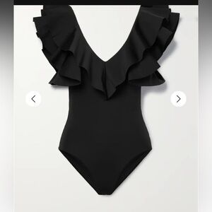 Maygel Coronel “Santa” one piece swimsuit. Signature double layer ruffles at v back and front neckline. Black. One size.