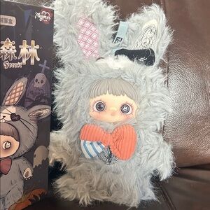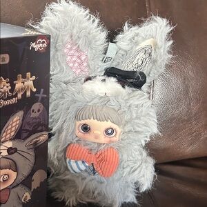 Adorable gray plush toy with bunny ears. Features a cute face and colorful details.
