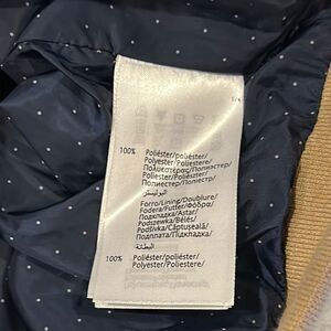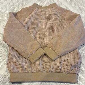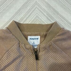 Mayoral Boys Tan Bomber Jacket with Perforated Design - Size 6. Stylish tan bomber jacket by Mayoral. Features a perforated design and zip closure. Front pockets. 15” pit to pit and 18” shoulder to front hem. Gently worn.