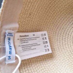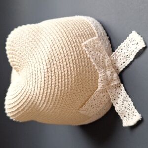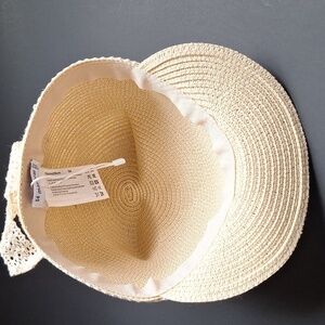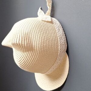 Straw sun visor beach hat features white lace detail and kitten/teddy bear ears. Cute and adorable on your child while providing uv protection. Measures head circumference 21.5", size 6 3/4
