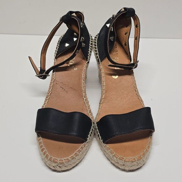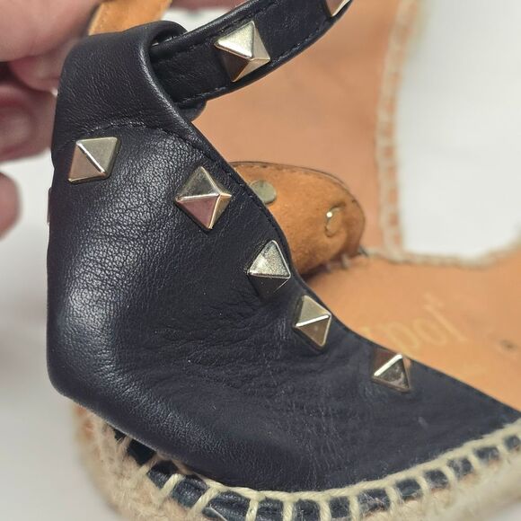 Maypol Anthropologie Espadrille Open toe Pyramid Studded Black Leather Ankle Wrap Sandals. Made in Spain.